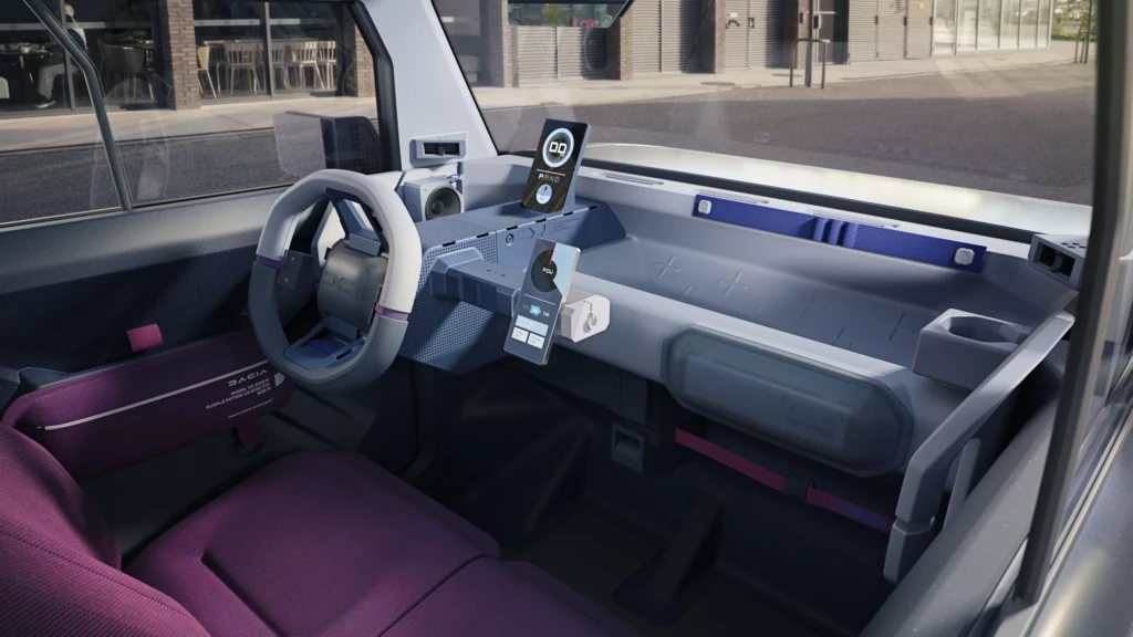 Салон мінімалістичний: тканинні петлі замість ручок, кріплення YouClip для аксесуарів, док-станція для смартфона як цифрового ключа, Bluetooth-колонка та великий екран.