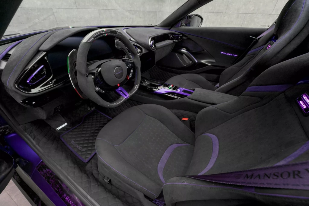 Інтер’єр Mansory Ferrari 12Cilindri Equestre прикрашений вуглецевим кермом, спортивними сидіннями, ременями з логотипом, алюмінієвими педалями та стьобаними килимками. Центральна смуга в кольорах італійського триколору завершує образ.