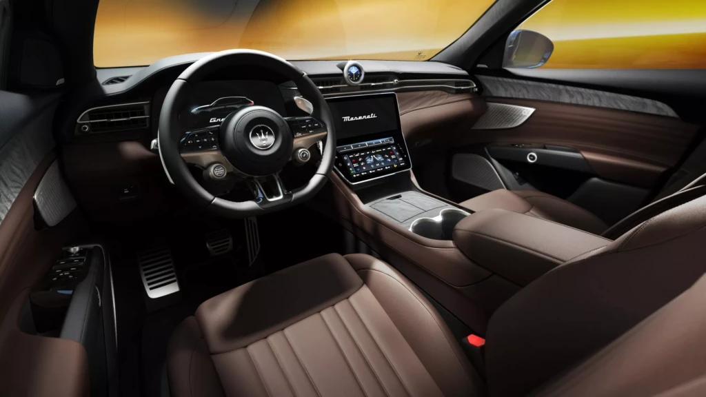 Інтер’єр Grecale Lumina Blue оформлений у коричневій шкірі з вставками з пористого дерева. У комплектацію входить панорамний дах, підігрів керма, 14-рівнева ручна регуляція передніх сидінь, камера кругового огляду та сталеві педалі.
