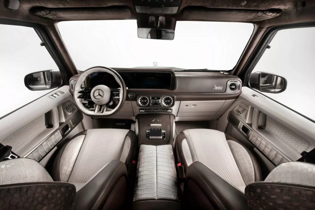 Позашляховик Mercedes G-Class Carlex отримав унікальний кузов у білому кольорі з додаванням одного кілограма алмазного пилу, що надає блиску. У комплектацію входять агресивний обвіс, хромовані елементи, ретро-диски з білими боковинами та вінтажні шильдики.