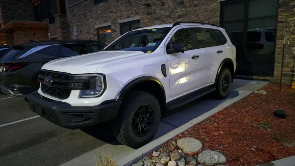 На фото — белый Everest с чёрными дисками и массивными внедорожными шинами. Передний бампер укорочен, как у Ranger Tremor. В салоне — кожаные сиденья с контрастной строчкой, шильдики Platinum, а также док-станция для ноутбука — всё указывает на то, что это тестовый экземпляр.